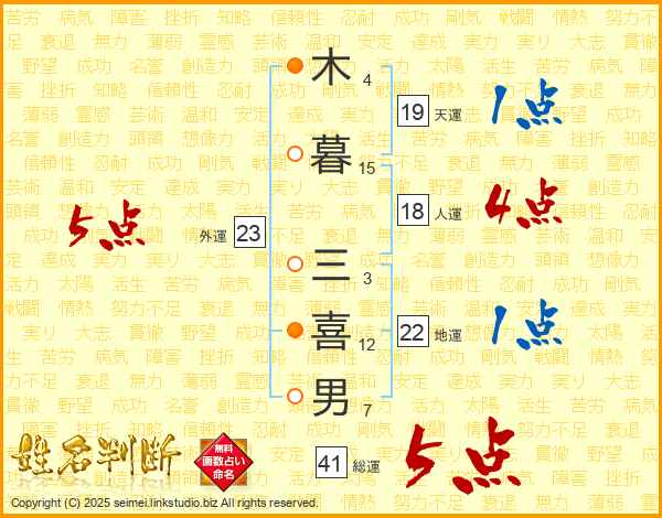 木(4画)暮(15画) 三(3画)喜(12画)男(7画)