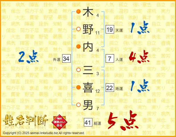 木(4画)野(11画)内(4画) 三(3画)喜(12画)男(7画)