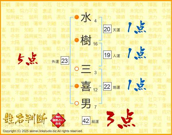 水(4画)樹(16画) 三(3画)喜(12画)男(7画)