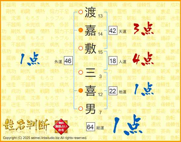 渡(13画)嘉(14画)敷(15画) 三(3画)喜(12画)男(7画)
