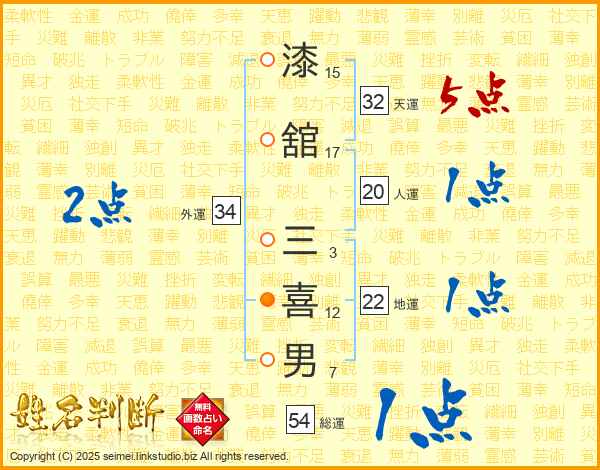 漆(15画)舘(17画) 三(3画)喜(12画)男(7画)