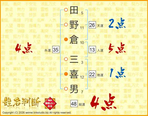 田(5画)野(11画)倉(10画) 三(3画)喜(12画)男(7画)