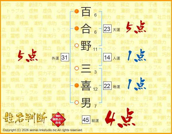 百(6画)合(6画)野(11画) 三(3画)喜(12画)男(7画)