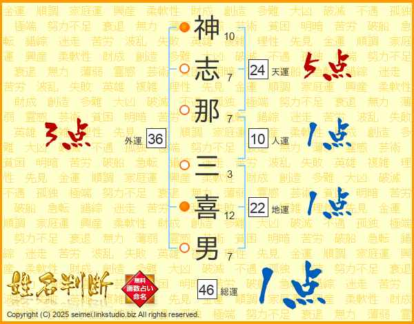 神(10画)志(7画)那(7画) 三(3画)喜(12画)男(7画)