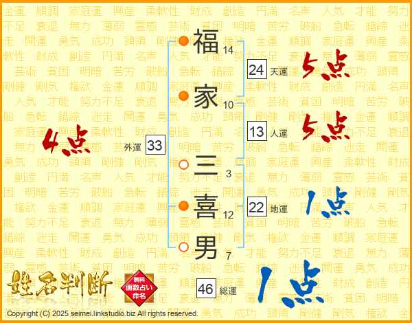 福(14画)家(10画) 三(3画)喜(12画)男(7画)