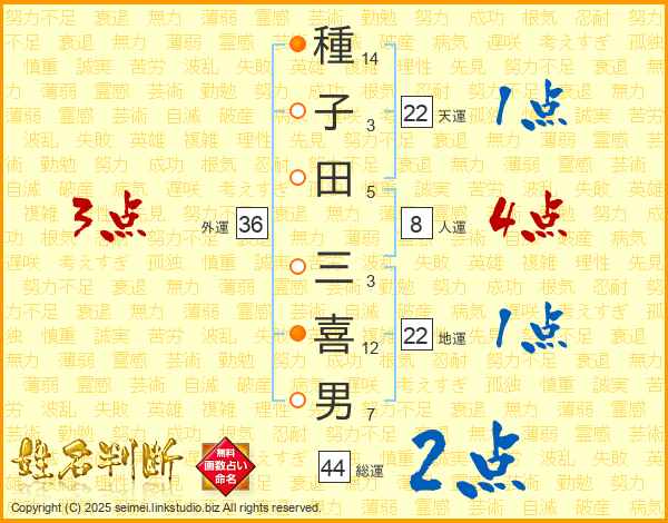 種(14画)子(3画)田(5画) 三(3画)喜(12画)男(7画)