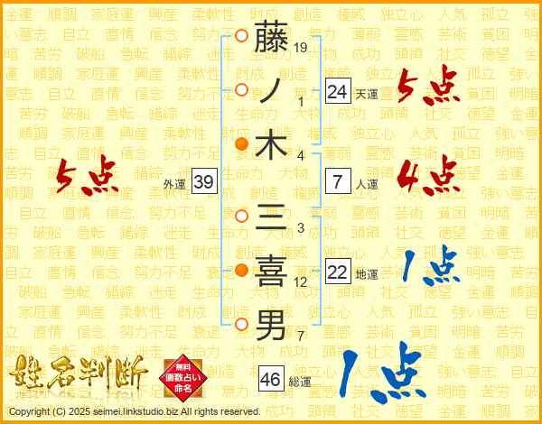藤(19画)ノ(1画)木(4画) 三(3画)喜(12画)男(7画)