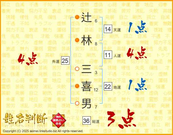 辻(6画)林(8画) 三(3画)喜(12画)男(7画)