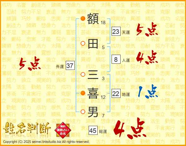 額(18画)田(5画) 三(3画)喜(12画)男(7画)