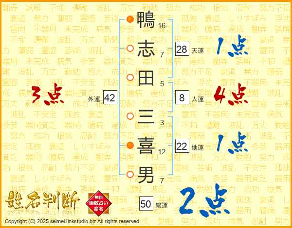鴨(16画)志(7画)田(5画) 三(3画)喜(12画)男(7画)