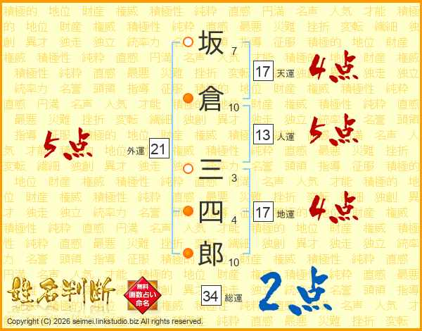 坂(7画)倉(10画) 三(3画)四(4画)郎(10画)
