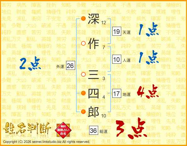 深(12画)作(7画) 三(3画)四(4画)郎(10画)
