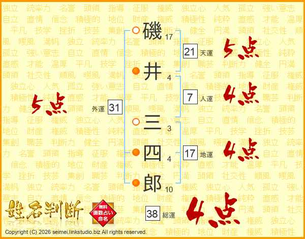 磯井三四郎さんの総運は38画の4点!