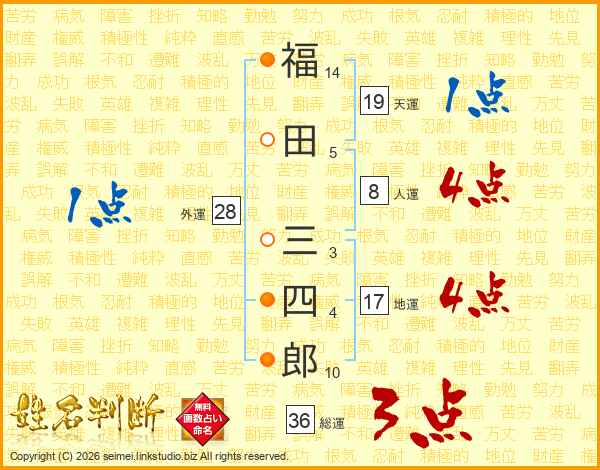 福(14画)田(5画) 三(3画)四(4画)郎(10画)