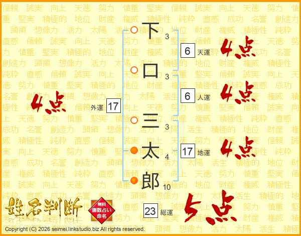 下口三太郎さんの総運は23画の5点!