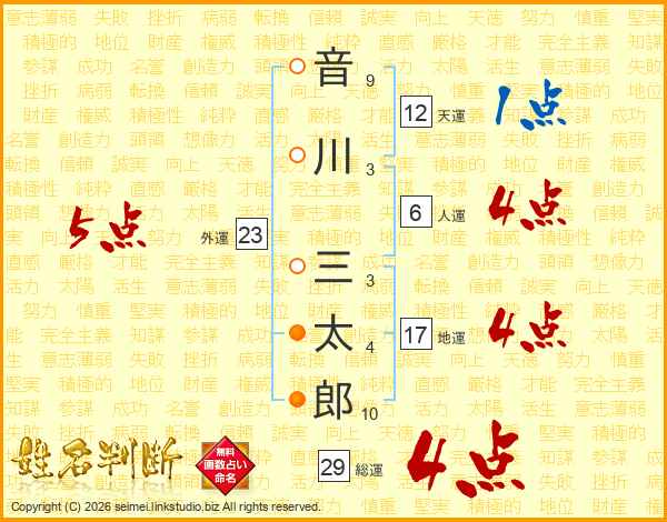 音(9画)川(3画) 三(3画)太(4画)郎(10画)