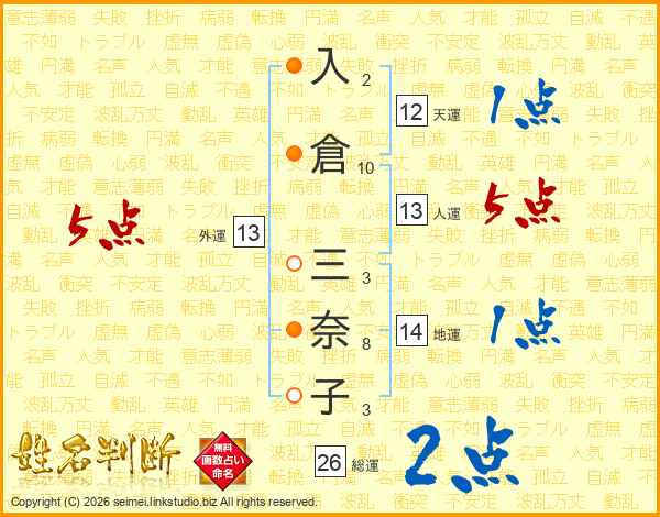 入倉三奈子さんの人運は13画の5点!