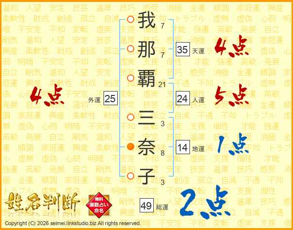 我(7画)那(7画)覇(21画) 三(3画)奈(8画)子(3画)