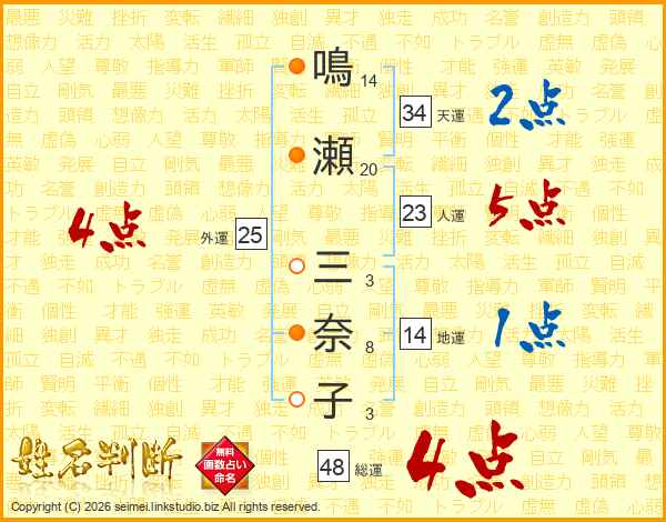 鳴(14画)瀬(20画) 三(3画)奈(8画)子(3画)