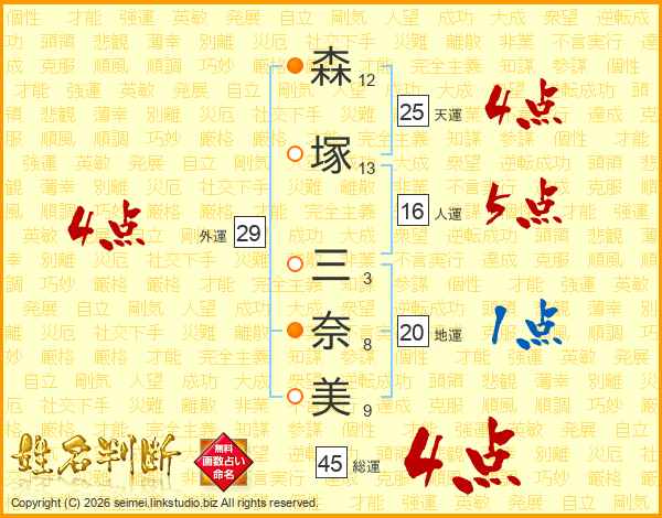 森(12画)塚(13画) 三(3画)奈(8画)美(9画)