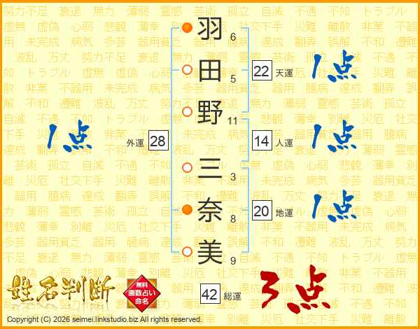 羽(6画)田(5画)野(11画) 三(3画)奈(8画)美(9画)