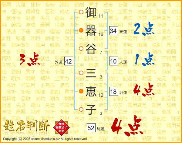 御(11画)器(16画)谷(7画) 三(3画)恵(12画)子(3画)