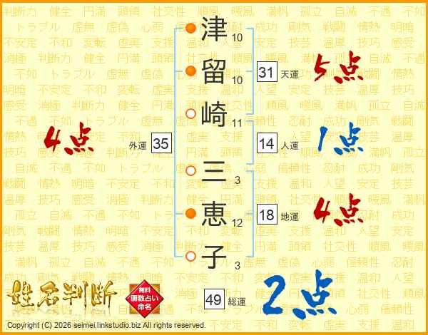 津(10画)留(10画)崎(11画) 三(3画)恵(12画)子(3画)