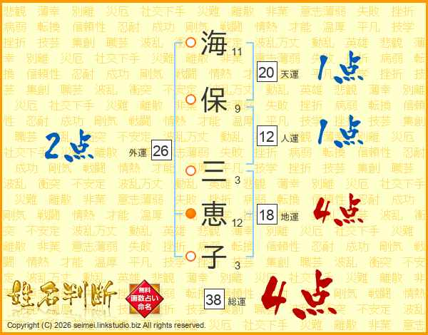 海保三恵子さんの総運は38画の4点!