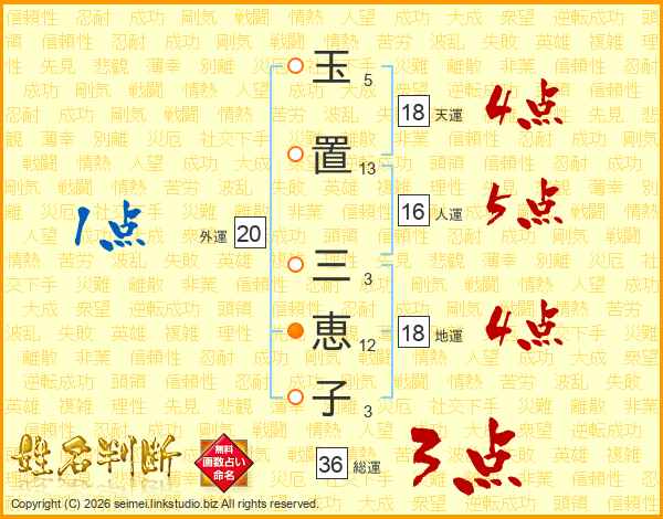玉(5画)置(13画) 三(3画)恵(12画)子(3画)