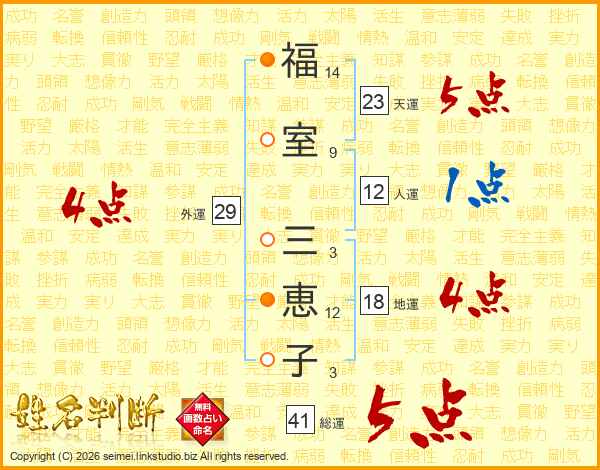 福(14画)室(9画) 三(3画)恵(12画)子(3画)