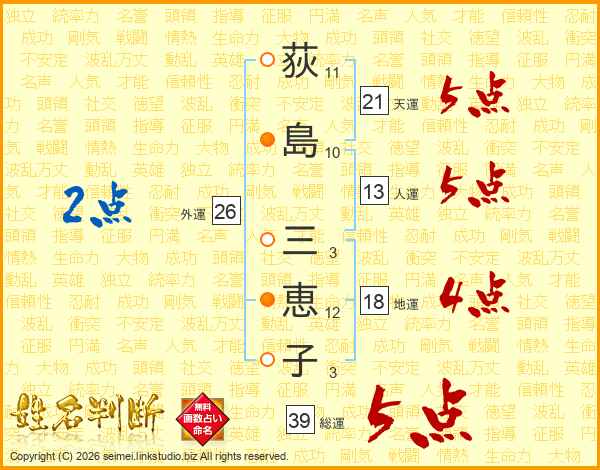 荻(11画)島(10画) 三(3画)恵(12画)子(3画)