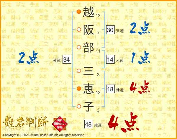 越(12画)阪(7画)部(11画) 三(3画)恵(12画)子(3画)