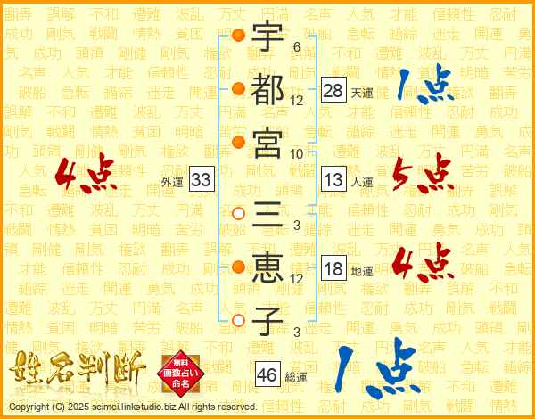 宇都宮三恵子さんの外運は33画の4点!