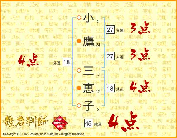 小(3画)鷹(24画) 三(3画)恵(12画)子(3画)
