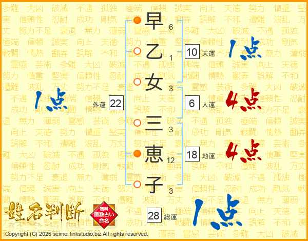 早(6画)乙(1画)女(3画) 三(3画)恵(12画)子(3画)
