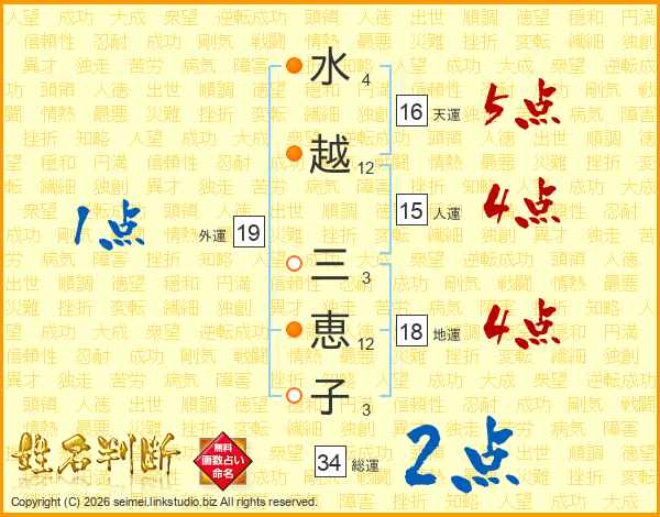 水(4画)越(12画) 三(3画)恵(12画)子(3画)