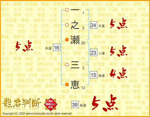 一(1画)之(3画)瀬(20画) 三(3画)恵(12画)