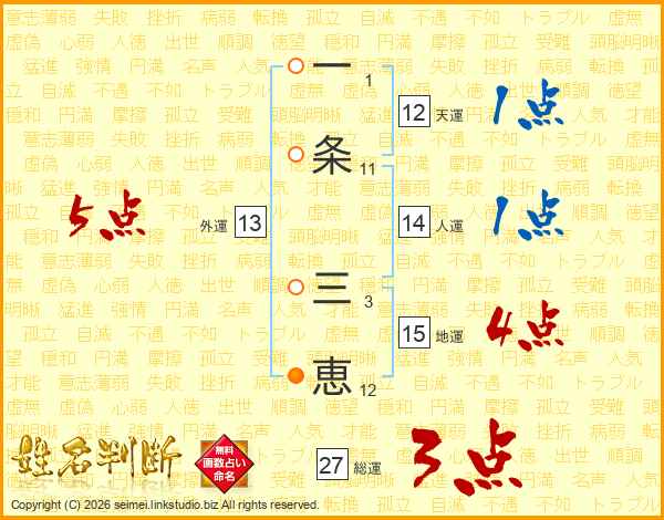 画数の奇数(○陽)と偶数(●陰)の配列で吉凶を占います。どちらかにかたよる名前は大凶名で避ける必要があります。画数の奇数偶数。