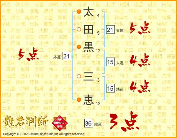 太(4画)田(5画)黒(12画) 三(3画)恵(12画)