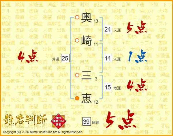 奥(13画)崎(11画) 三(3画)恵(12画)