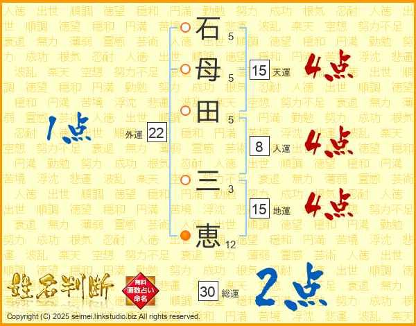 石(5画)母(5画)田(5画) 三(3画)恵(12画)
