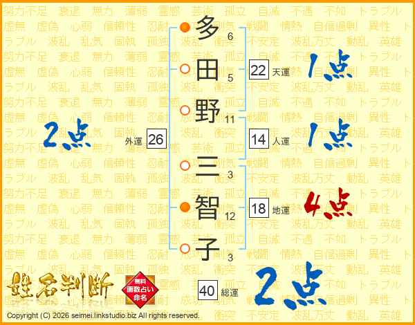 多(6画)田(5画)野(11画) 三(3画)智(12画)子(3画)