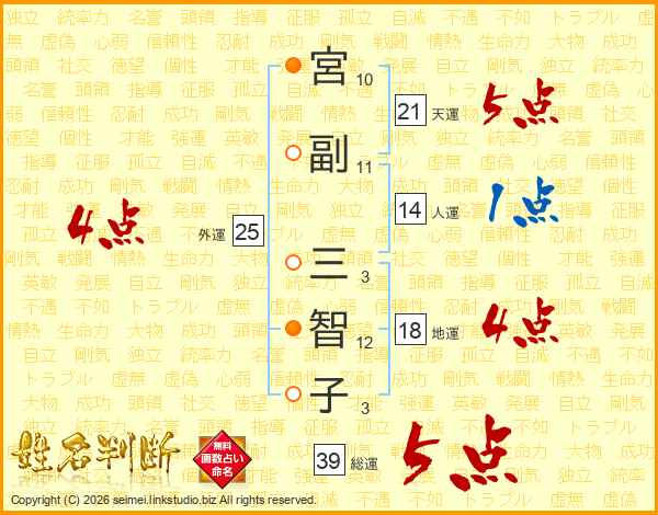 宮(10画)副(11画) 三(3画)智(12画)子(3画)