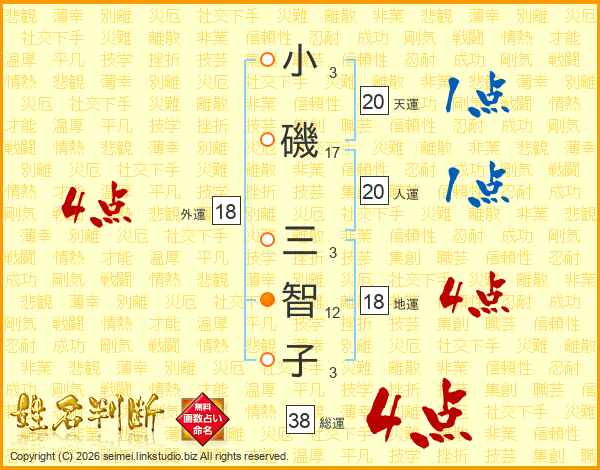 小(3画)磯(17画) 三(3画)智(12画)子(3画)