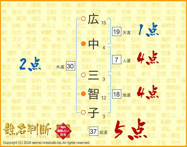 広(15画)中(4画) 三(3画)智(12画)子(3画)