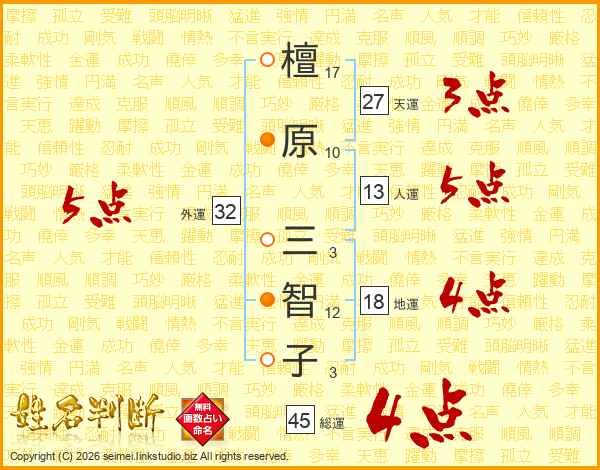 檀(17画)原(10画) 三(3画)智(12画)子(3画)