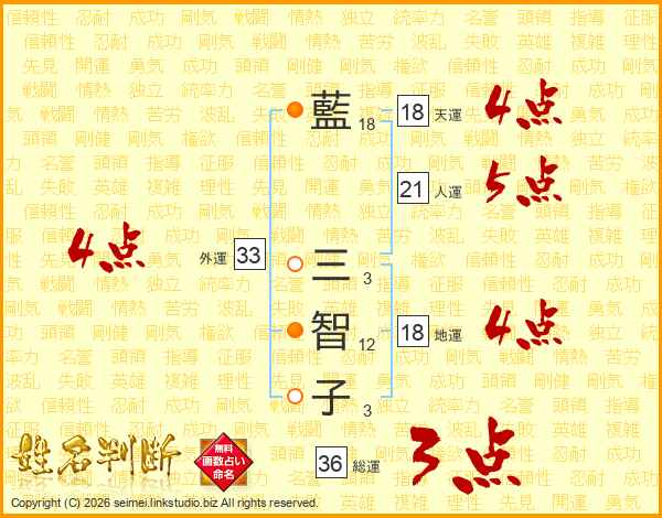 生活面を象徴する運勢です。外部から受ける影響力を表し、結婚運、家庭運や職場、環境への順応性を表します。総運から人運を引いた画数。姓や名が1文字の場合を除く。