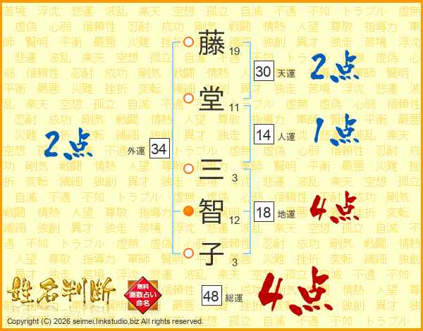 藤(19画)堂(11画) 三(3画)智(12画)子(3画)