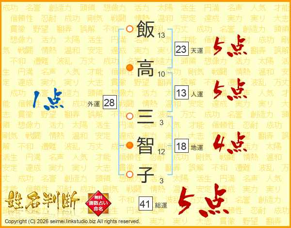 飯(13画)高(10画) 三(3画)智(12画)子(3画)