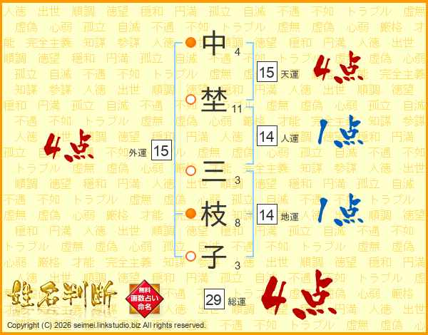 中(4画)埜(11画) 三(3画)枝(8画)子(3画)